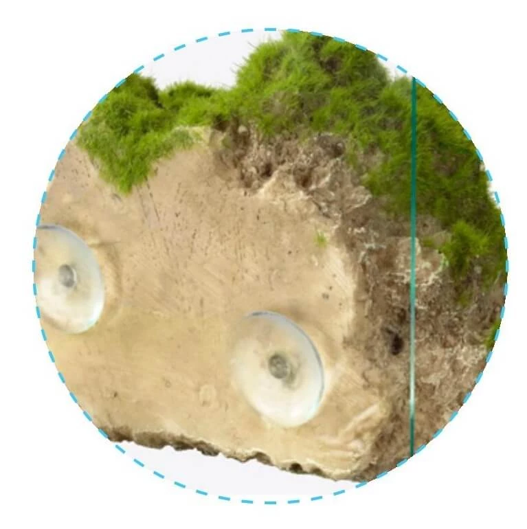 Pietra finta in resina, con spugna finta e una ventosa che permette di fissarla alla parete dell’acquario.