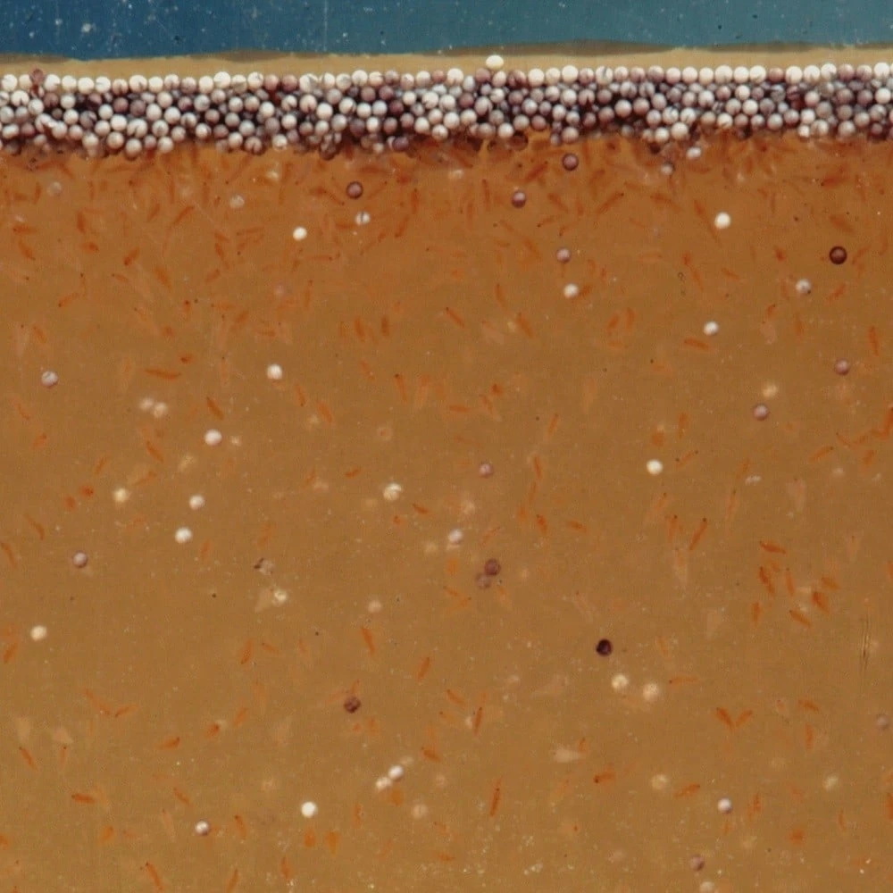 Una volta che la schiusa è terminata, è necessario interrompere l’aerazione. I naupli si raggruppano in pochi minuti sul fondo della bottiglia e le conchiglie vuote sulla superficie dell’acqua. Attenzione: non aspettare troppo a lungo ad aspirare altrimenti i naupli possono morire di soffocamento. Ora, è possibile aspirare i naupli con un tubo sottile per spostarli in un setaccio per artemia (negozio specializzato). Risciacquare rapidamente con acqua fresca e poi somministrare agli avannotti. Pulire accuratamente la bottiglia prima della successiva schiusa.