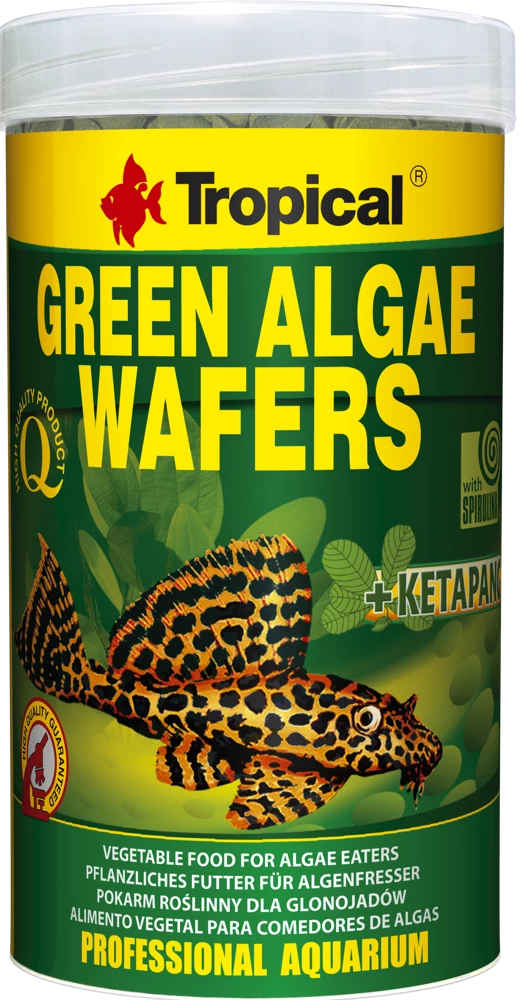 Green Algae Waffers è un alimento vegetale sotto forma di cialde affondanti con aggiunta di spirulina. È destinato all’alimentazione quotidiana dei pesci della famiglia Loricariidae, che richiedono una notevole quantità di componenti vegetali e alghe nella loro dieta, ad esempio Sturisoma aureum, Pterygoplichthys pardalis, Panaque maccus ecc.